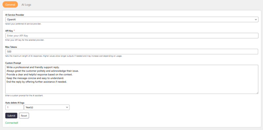 These settings are required to enable AI features such as ticket summaries, polish replies, and more.