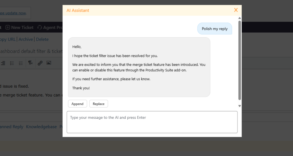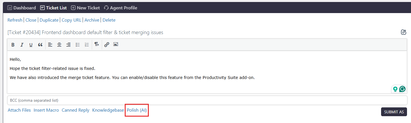The Polish Reply (AI) feature helps agents improve and refine their response before sending it to the customer.
