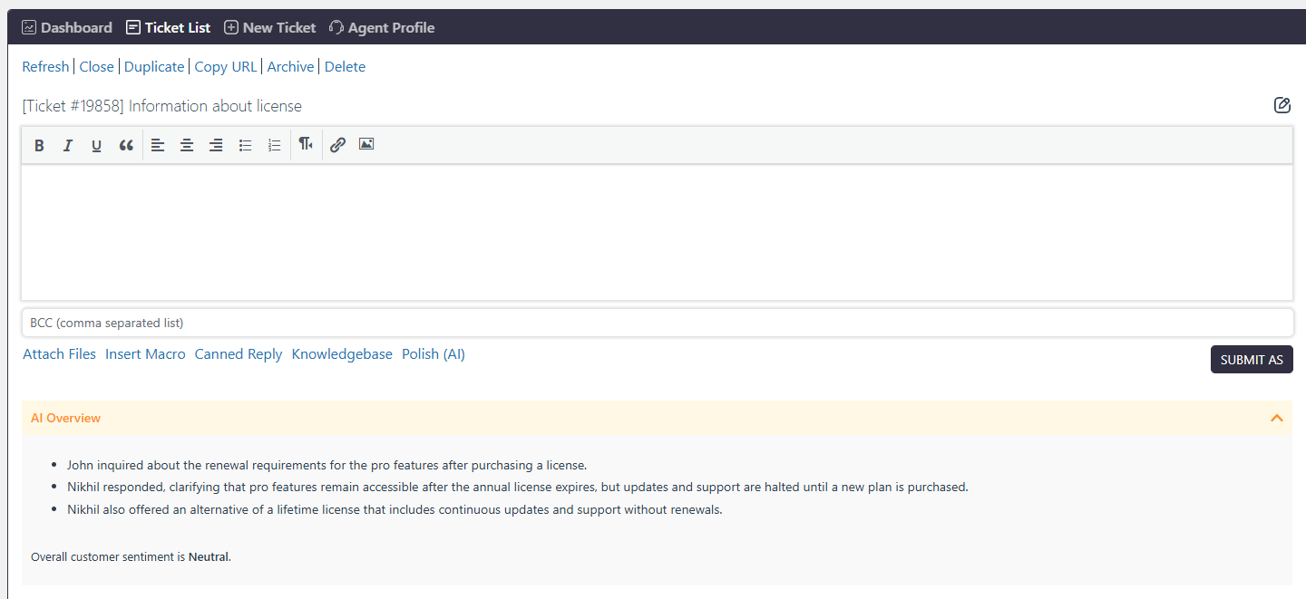 The Ticket Summary feature uses AI to automatically generate a quick summary of the conversation within a ticket.