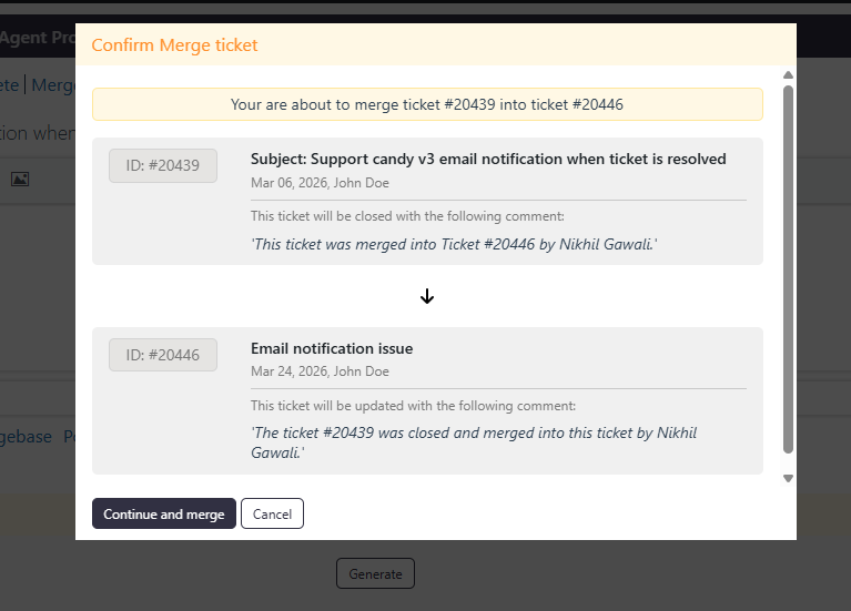 The Merge Ticket feature allows agents to combine multiple tickets from the same user into a single ticket, helping avoid duplicate work and keep conversations organized. Tickets from different users cannot be merged. When tickets are merged, a note is added to both tickets indicating the merge, ensuring clear tracking and transparency.